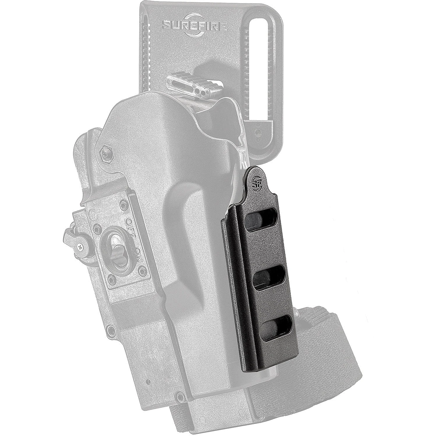 The SureFire V98 MasterFire Pro PALS Rail is a versatile and durable accessory attachment rail designed to enhance the functionality of the MasterFire Pro holster. It provides a secure platform for attaching MOLLE-compatible gear, such as pouches, tourniquets, or flashlights, allowing for quick access to essential items. Built with high-strength polymer, it ensures durability and corrosion resistance while maintaining a lightweight design.